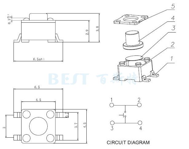 輕觸開關TS-1185E的尺寸3×4,基座高度為1.5,總體高度有1.8/2.0/2.5三種,有帶定位柱和不帶定位柱兩種選擇,一般常用帶定位柱。此款型號可稱為兩腳貼片輕觸開關或3×4貼片小烏龜開關。TS-1185E輕觸開關多適用于醫(yī)療,數(shù)碼,通訊器材,對講產(chǎn)品等。